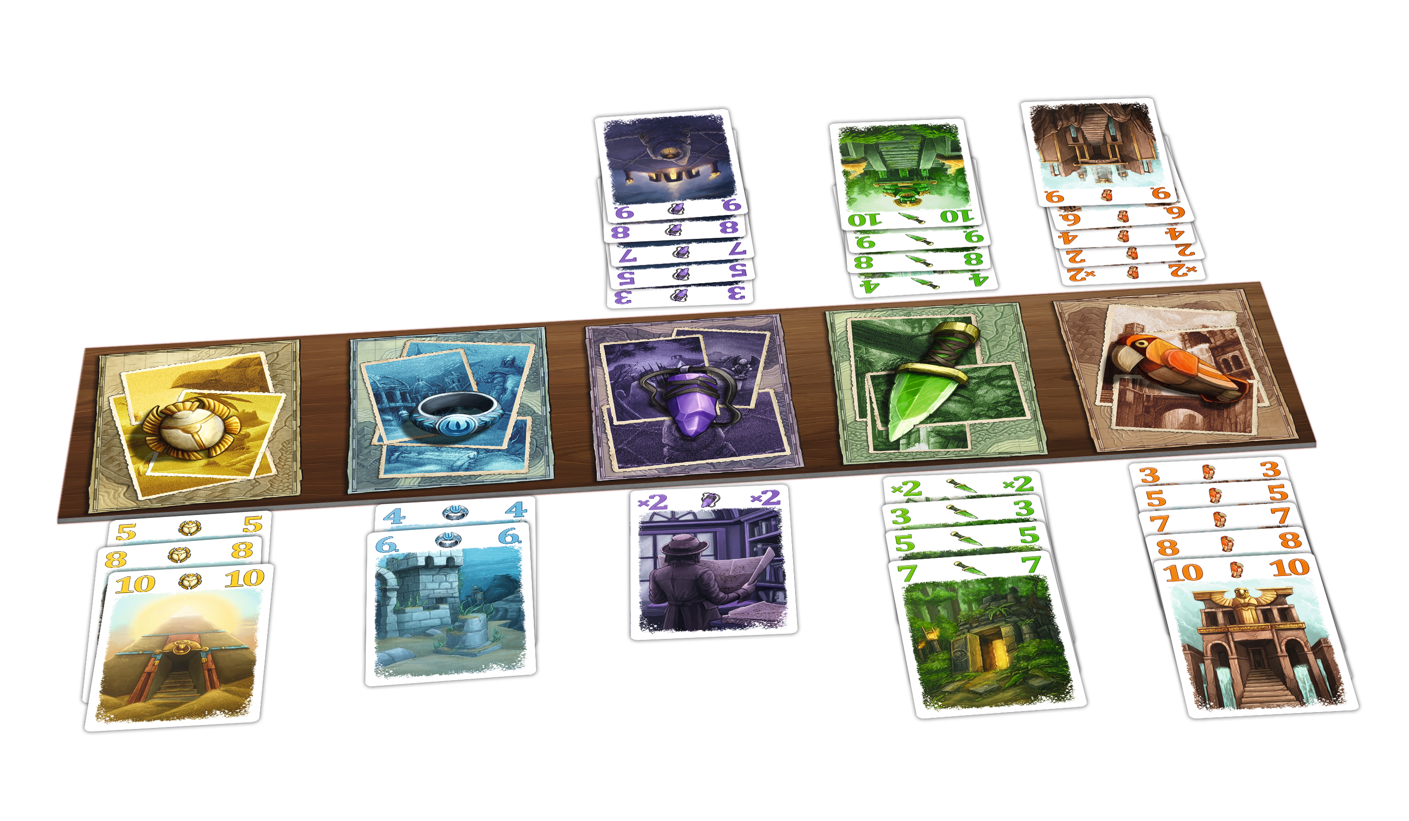 ジレンマたっぷりのカードゲームである本作は、5つ(5色)の目的地に2~10の数字カードを「どんどん数字が大きくなるように」並べなくてはいけません。1枚でもカードを置いたならその探検を「始めた」ことになり、最終的にコスト(-20点)を支払った後、数字合計が得点になります(マイナスになることも!)。カードの補充は捨て山から取ってくることもできるので、要らないカードを不用意に捨てると、相手プレイヤーに塩を送ることになるかも!?