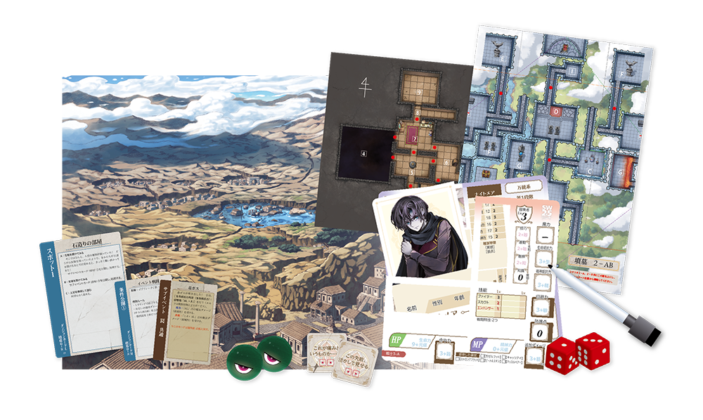 今回のシナリオは墳墓探索がテーマ。6つのダンジョン(地下迷宮とは限りません!)が収録されており、それぞれの展開はカード形式で表現。ゲームマスター(GM)なしでも手軽にプレイすることが可能です。往年のプレイヤーも大満足のボリュームをじっくり味わってください。